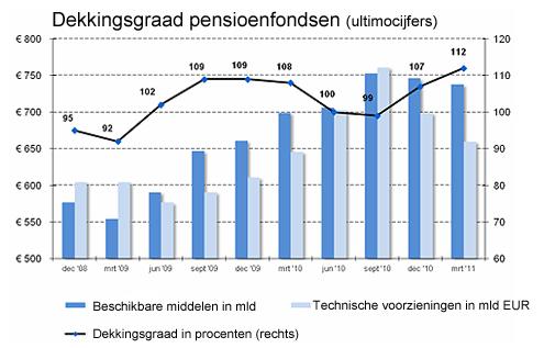 In het eerste kwartaal van 2011 zijn de verplichtingen van pensioenfondsen in de vorm van de zogenoemde technische voorzieningen met EUR 41 miljard gedaald tot EUR 660 miljard. Het is voor het tweede achtereenvolgende kwartaal dat de verplichtingen van pensioenfondsen zijn gedaald (zie grafiek). Door de hogere rente hoeven pensioenfondsen minder geld te reserveren voor toekomstige uitkeringen. In het laatste kwartaal van 2010 steeg de lange rente al van 3,0% naar 3,8%. In het eerste kwartaal van 2011 steeg de rente verder van 3,8% naar 4,0%.