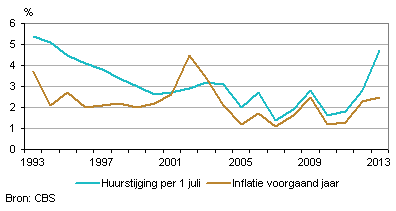 De maximale huurverhoging in 2013 was niet alleen gebaseerd op de inflatie van 2012, maar was ook afhankelijk van de inkomensklasse van de bewoners. De huurstijging in juli 2013 van 4,7 procent komt 2,2 procentpunt hoger uit dan de inflatie over het jaar 2012. In de jaren 2001–2012 kwam de huurstijging gemiddeld 0,3 procentpunt uit boven de inflatie in het voorgaande jaar. Het is voor het eerst sinds 1996 dat het verschil tussen de huurstijging en de inflatie in het voorliggende jaar meer dan 2 procentpunt bedraagt.