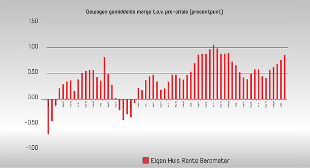 Tussen maart en november 2014 is de extra winstmarge van banken op hypotheken gegroeid van 0,43 naar 0,92 procentpunt: