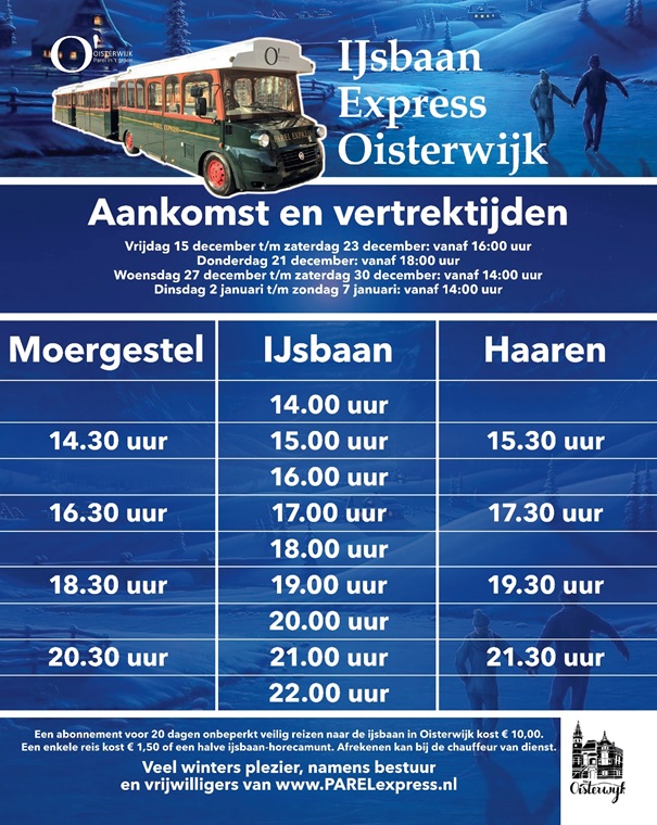Tot zondagavond 7 januari rijdt de IJSBAAN Express (bijna alle dagen) vanaf de dorpspleinen in Moergestel en Haaren naar de ijsbaan op de Lind in Oisterwijk.