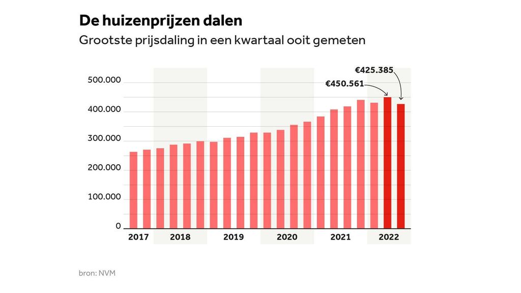 Er waait een andere wind op de woningmarkt, zo geven de nieuwste cijfers van makelaarsvereniging NVM aan. In het 3e kwartaal van dit jaar zijn de huizenprijzen met 5,8% gedaald ten opzichte van het 2e kwartaal. Dat is de grootste kwartaal-op-kwartaal-daling die de makelaarsvereniging ooit heeft gemeten.